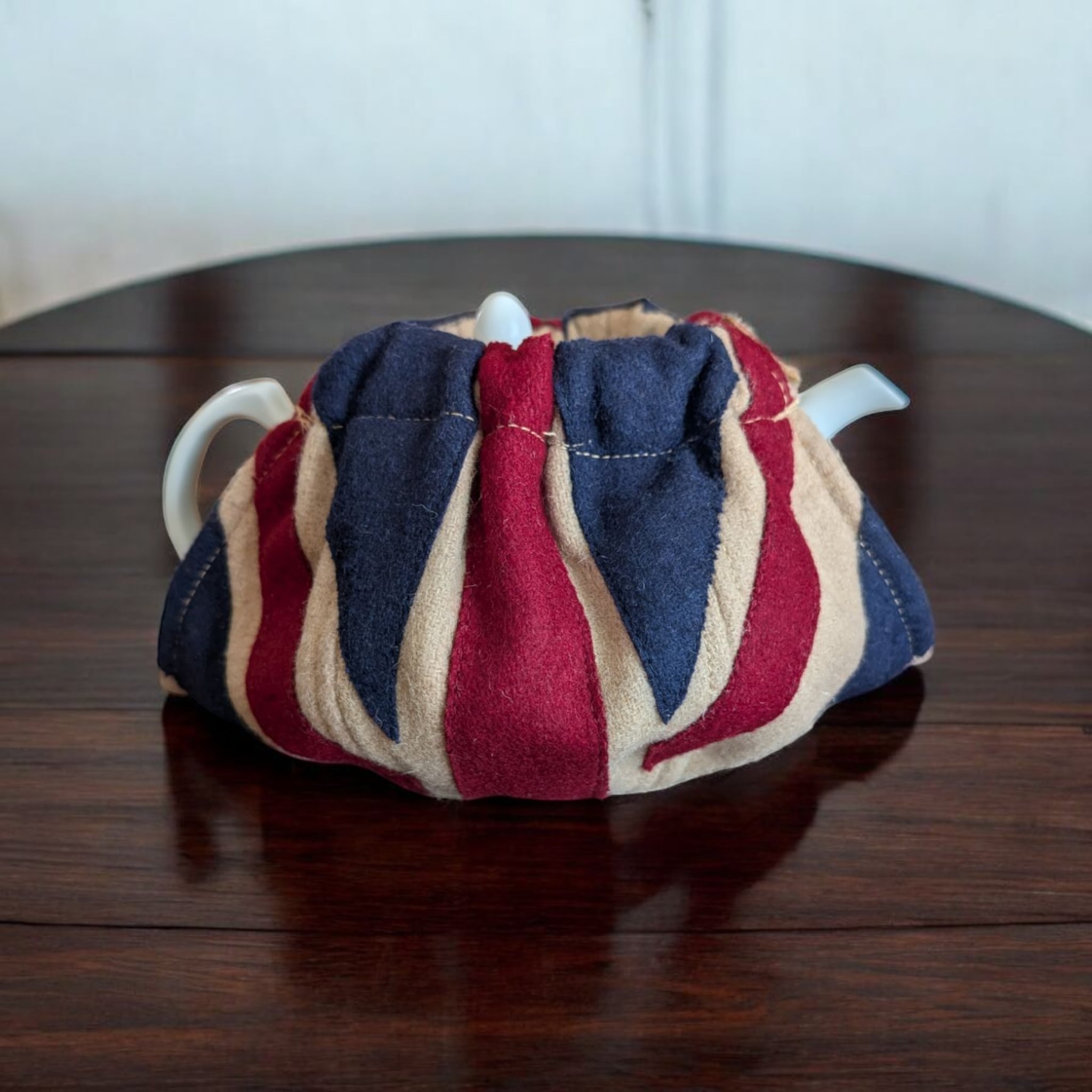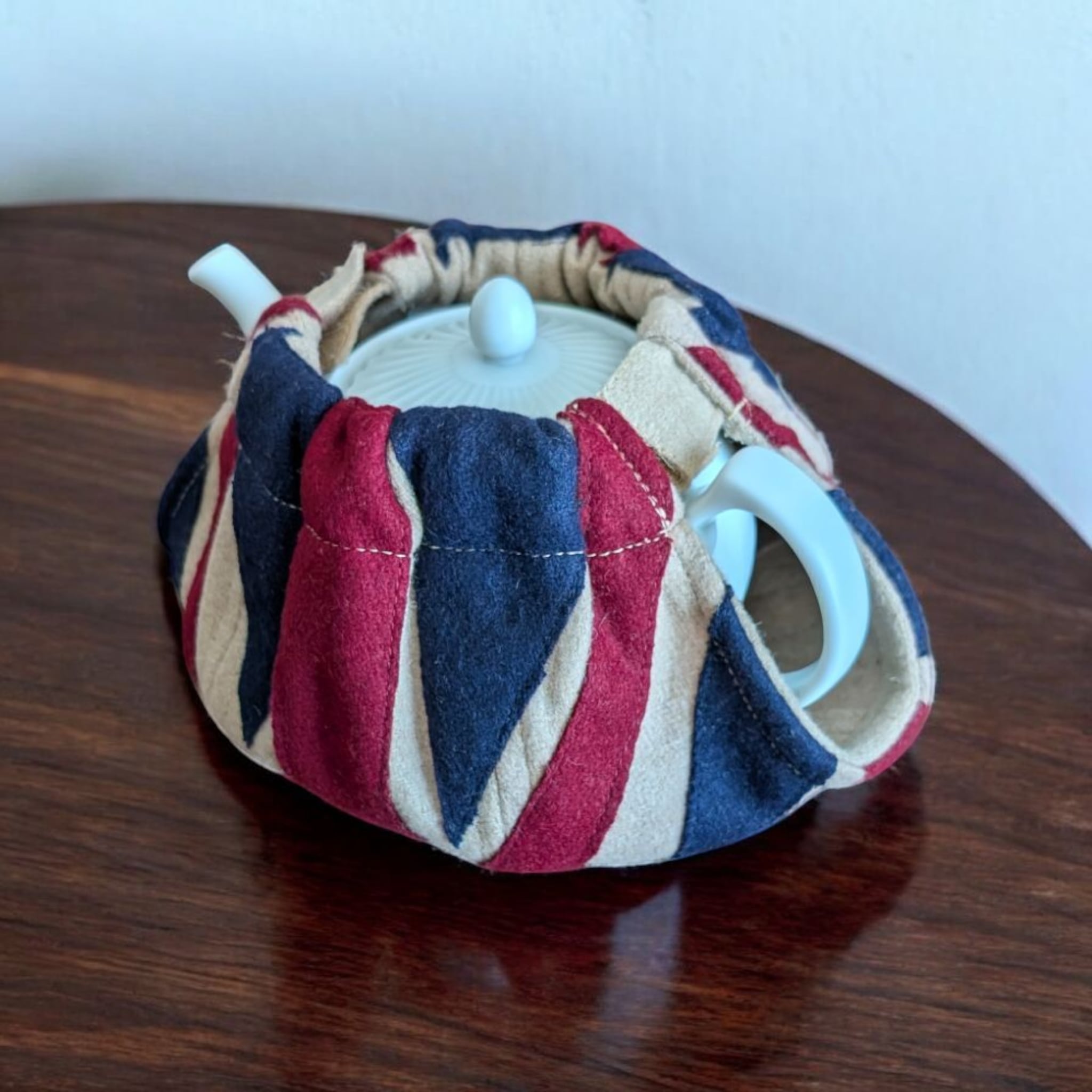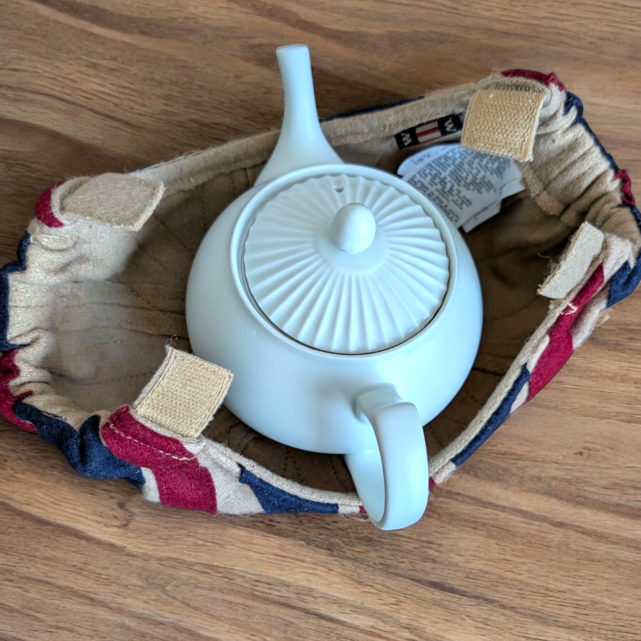 アンティーク調の落ち着いた色彩のユニオンジャック柄ティーコジー。広げた状態でティーポットを載せマジックテープでとめるオープントップタイプです。しっかりとした造りが特徴のWOVEN MAGIC(ウーヴン・マジック)社製。英国内の観光地やショッピングセンター内のショップで実際に販売されております。