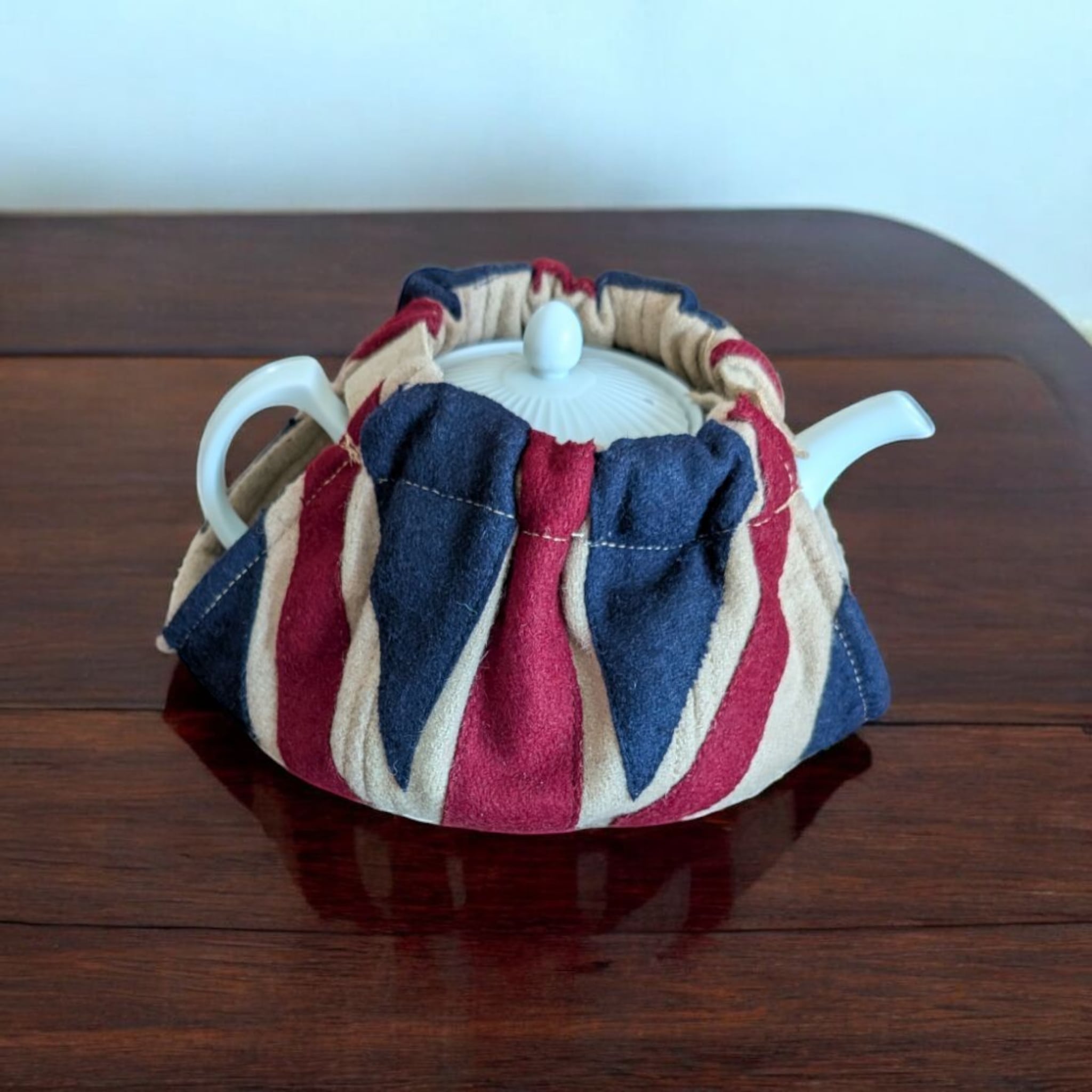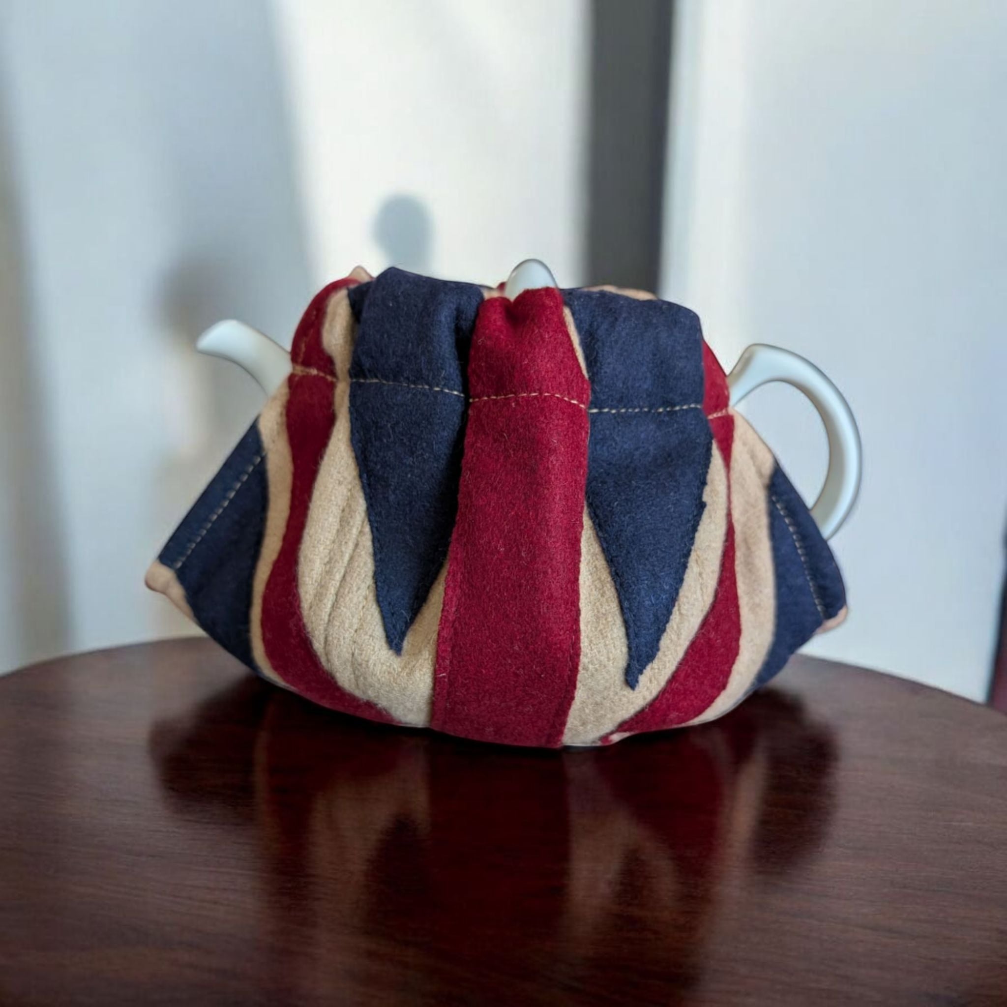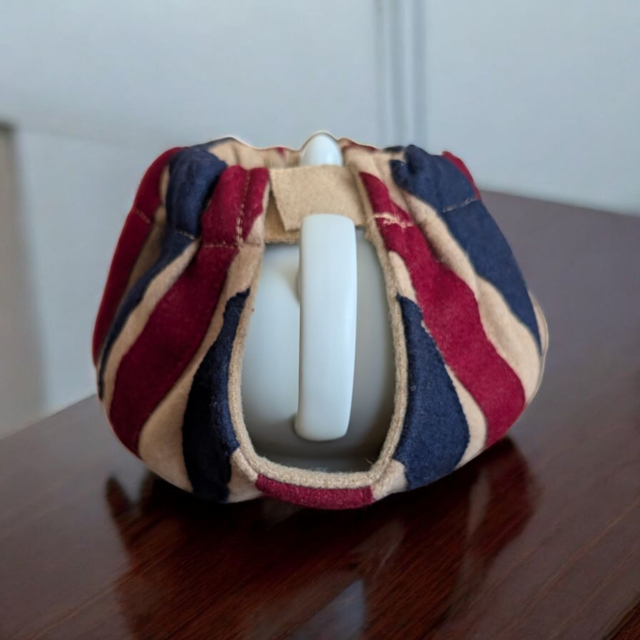 アンティーク調の落ち着いた色彩のユニオンジャック柄ティーコジー。広げた状態でティーポットを載せマジックテープでとめるオープントップタイプです。しっかりとした造りが特徴のWOVEN MAGIC(ウーヴン・マジック)社製。英国内の観光地やショッピングセンター内のショップで実際に販売されております。