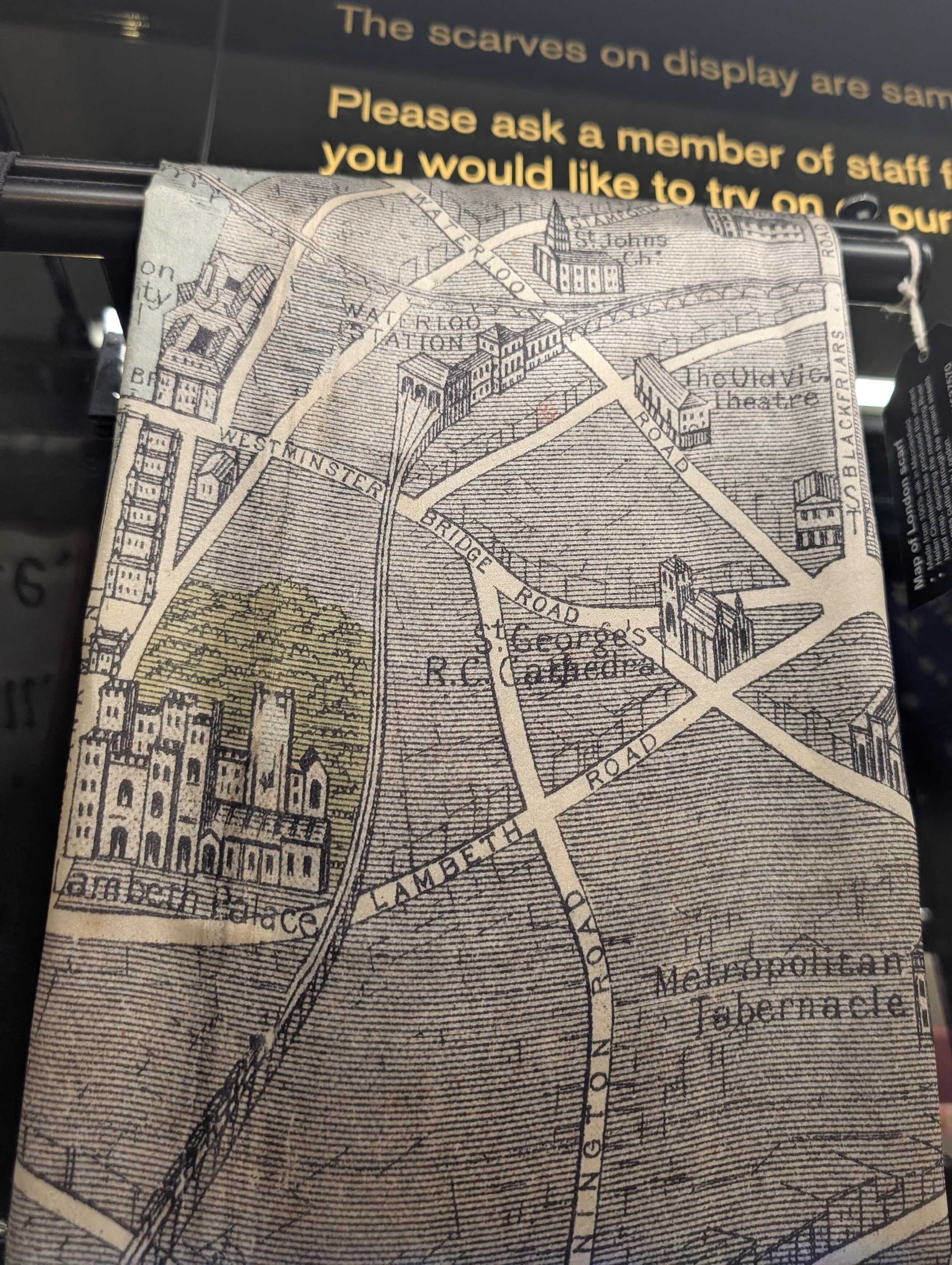 ロンドンの地図が描かれたシルク100%英国製スカーフ。ウェストミンスター寺院、大英博物館、バッキンガム宮殿などロンドンで有名な建物やテムズ川が描かれています。淡いブルーグリーンの縁取りがあり落ち着いた色合いです。