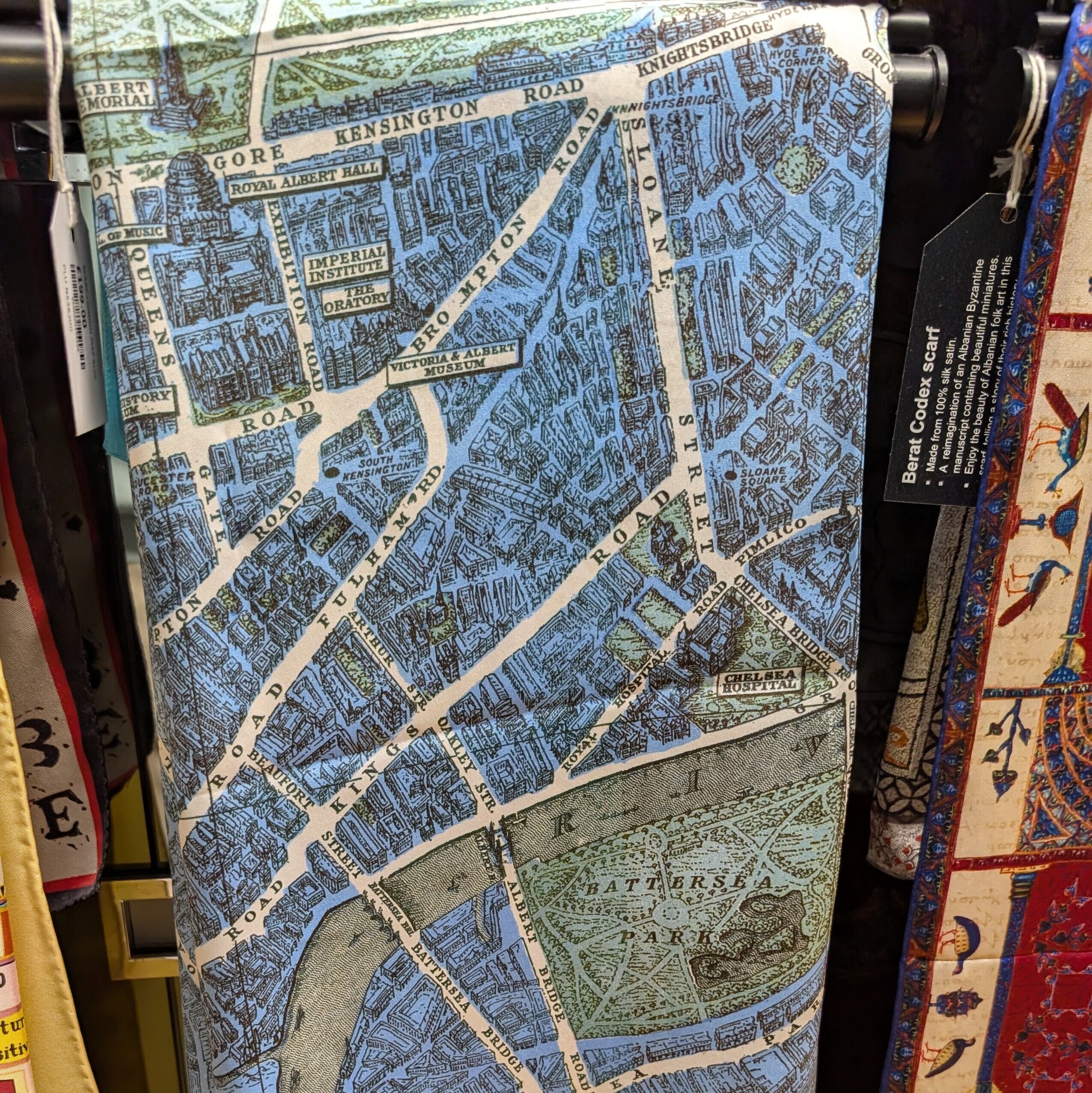 ロンドンの地図が描かれたシルク100%英国製スカーフ。ブルーを基調に街並みが描かれ、テムズ川や通りの名前、ミュージアムなどロンドンの有名な場所が記されています。