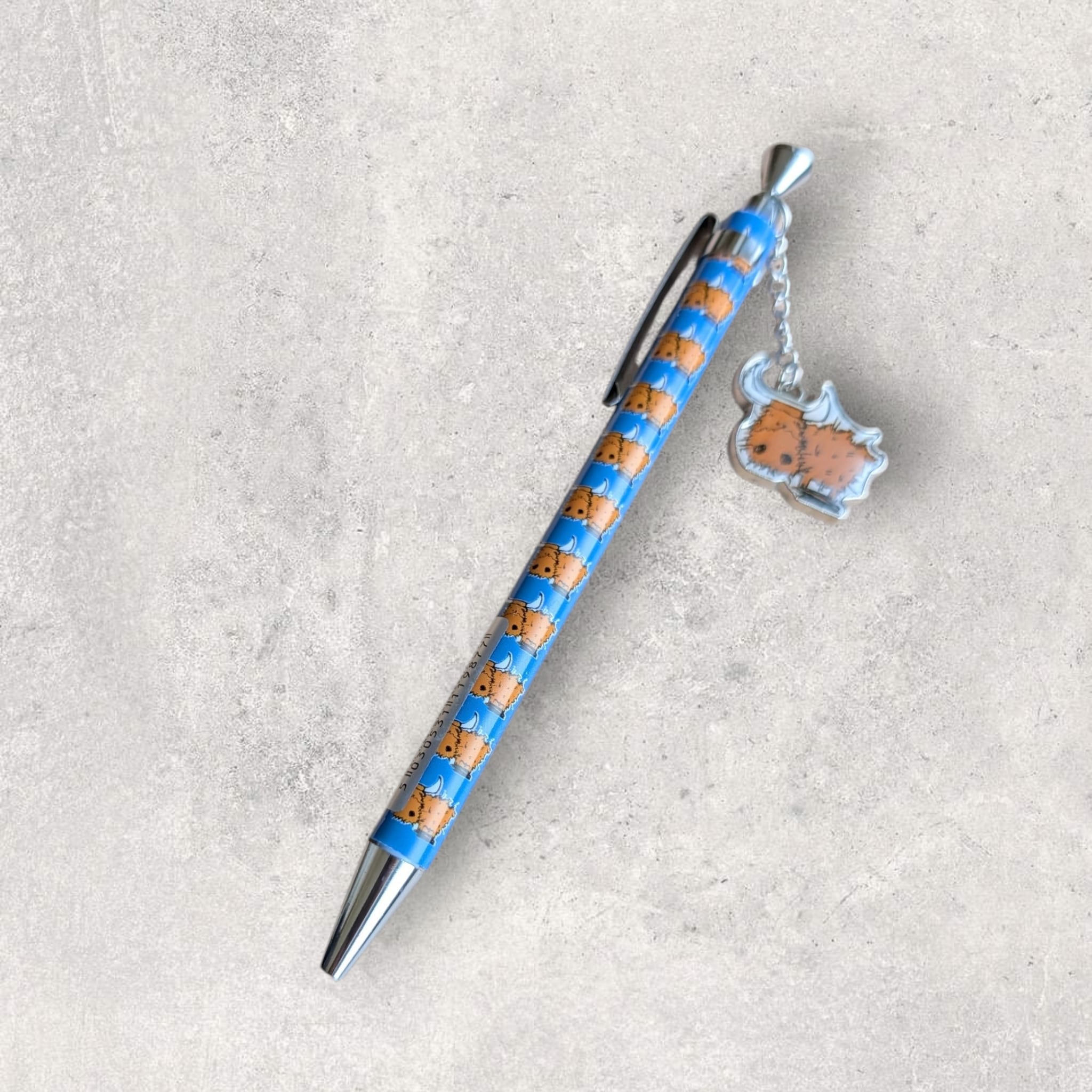 スコットランド北部のハイランド地方に多く生息するハイランドカウ(ハイランドクー)を可愛らしくデザインしたチャーム付きボールペン。