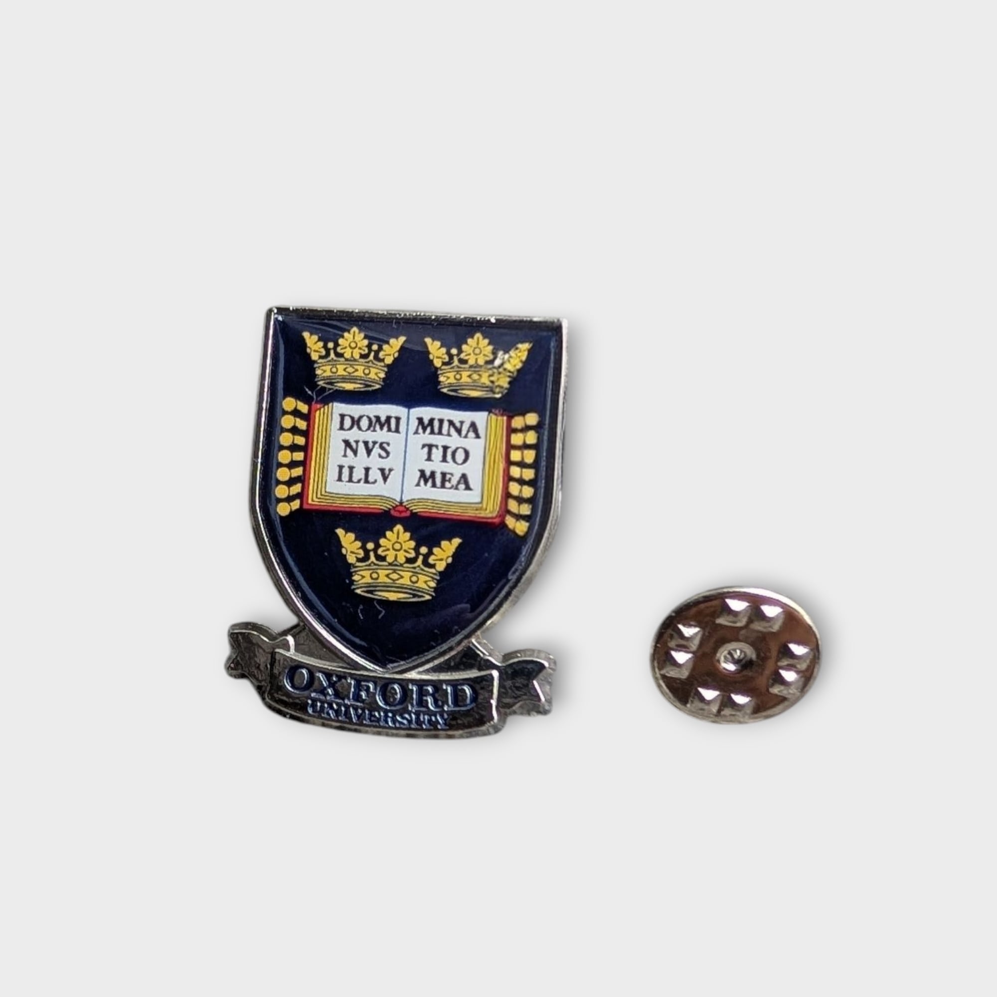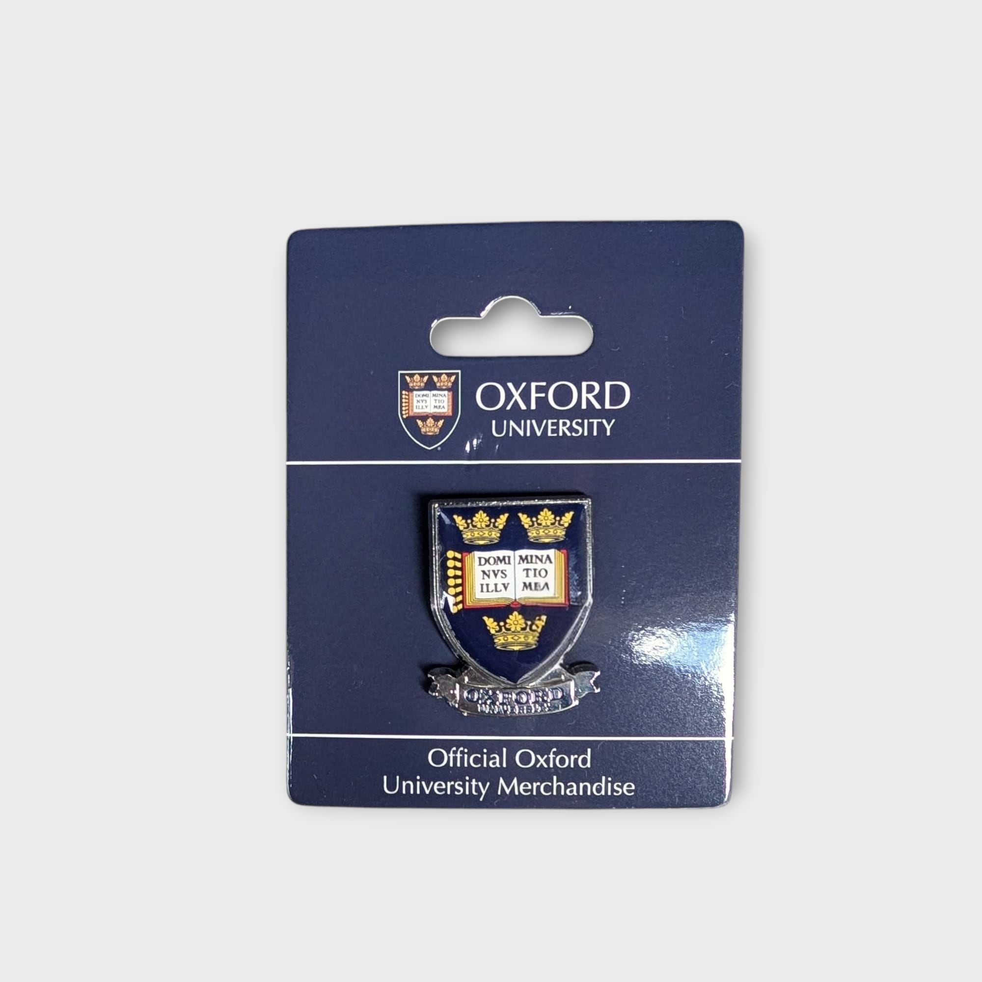 オックスフォード大学オフィシャルライセンスのピンバッジ。大学の名称とシールド型紋章がデザインされています。