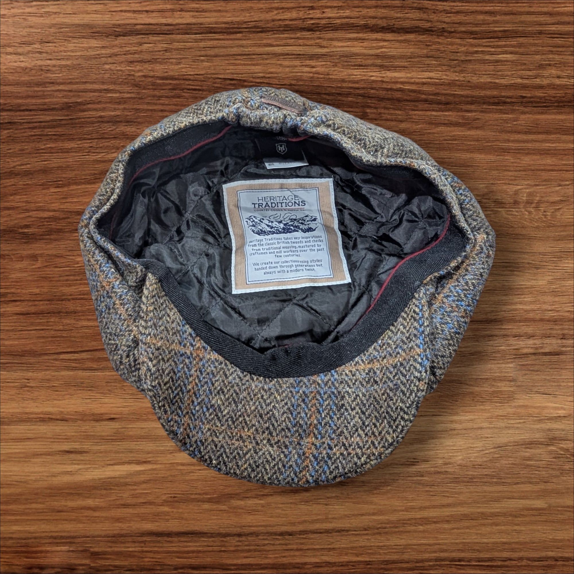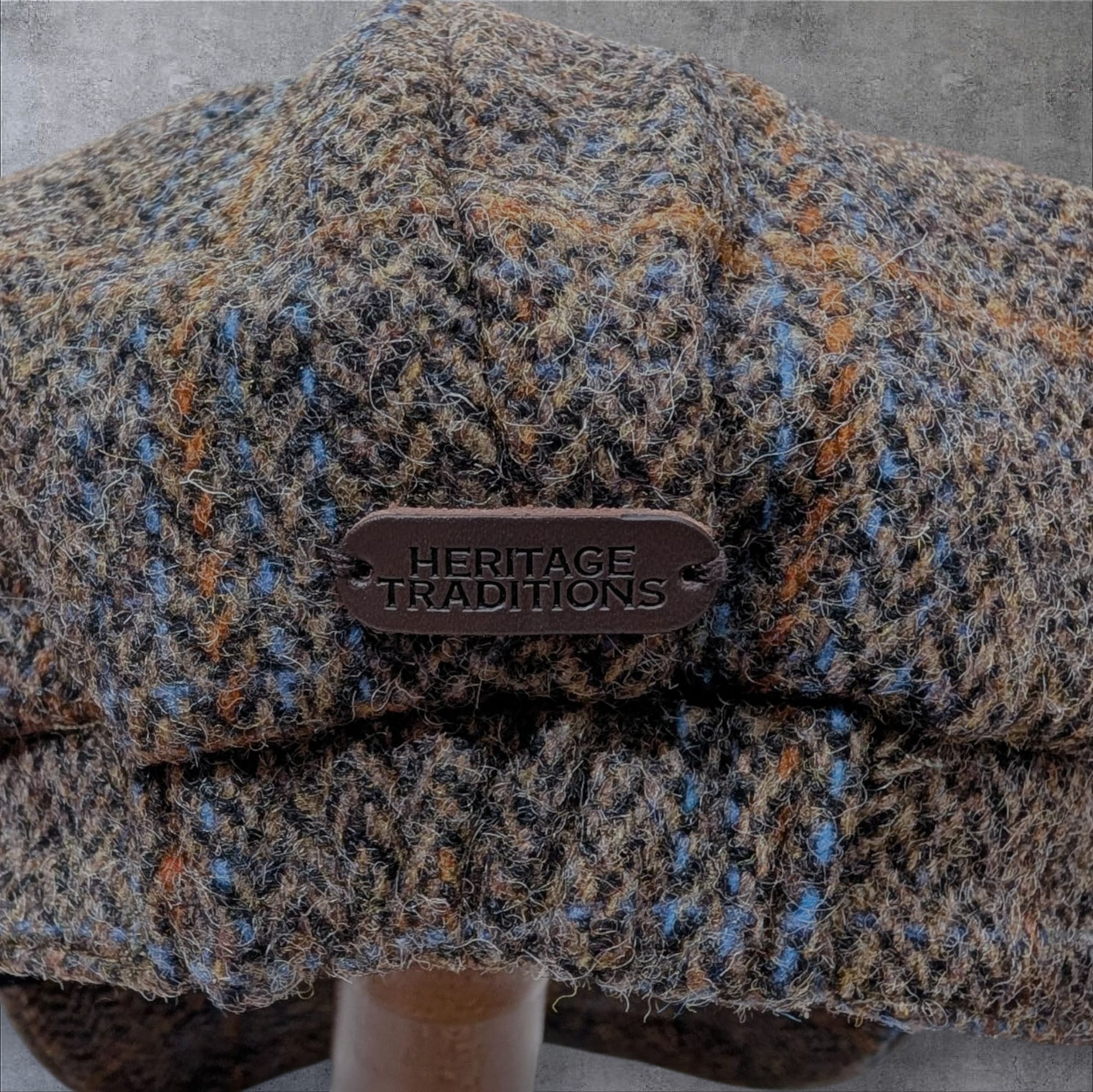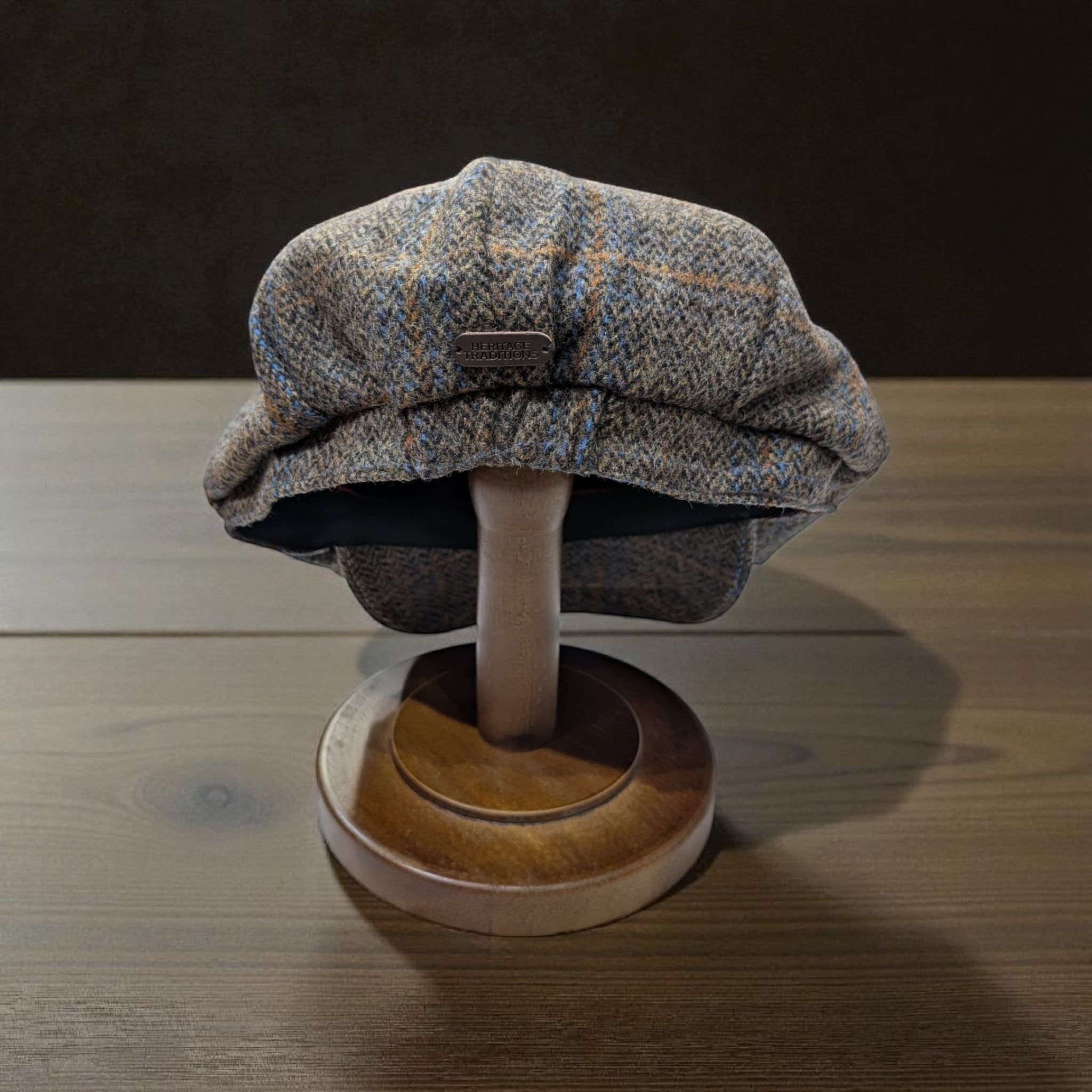 薄い茶系のヘリンボーン柄ニュースボーイキャップ。新聞配達員が使用していたことから名付けられた、頭頂部のボタンを中心にした8枚はぎのキャスケット型の帽子。