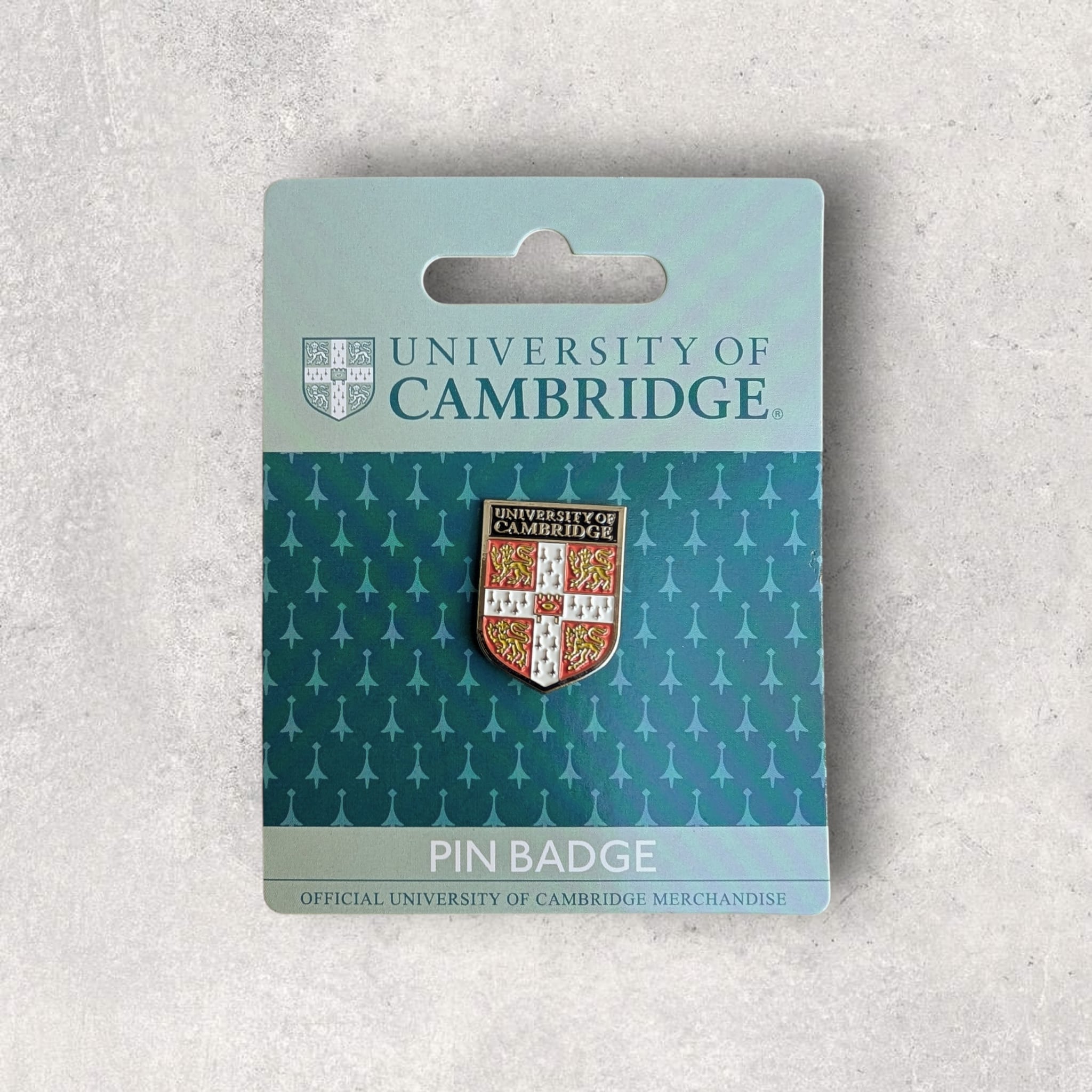 ケンブリッジ大学オフィシャルライセンスのピンバッジ。大学の名称とシールド型紋章がデザインされいます。台紙付き。