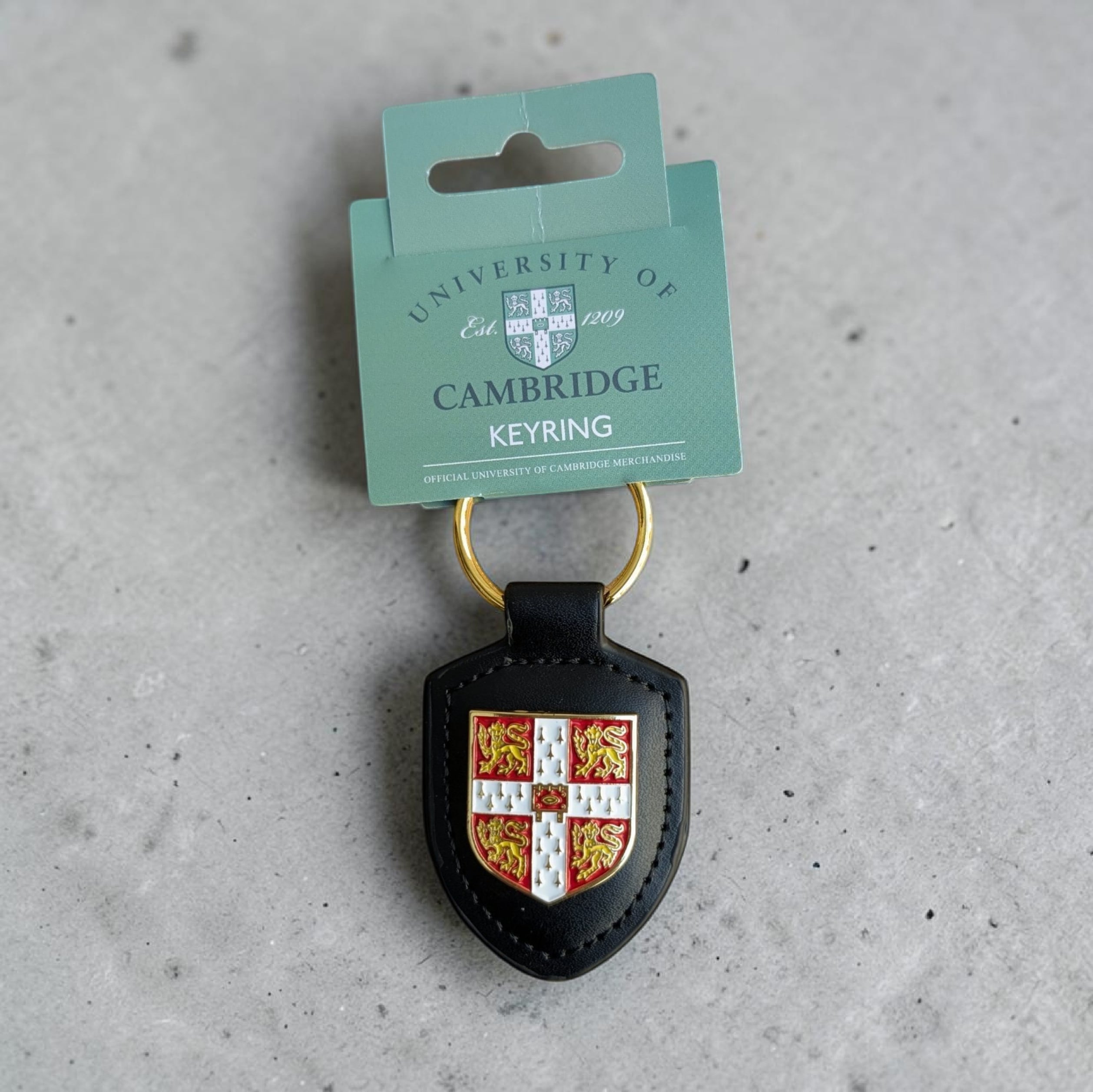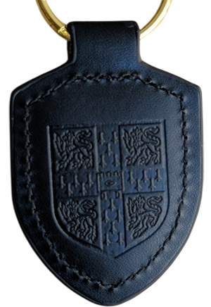 ケンブリッジ大学オフィシャルライセンスのキーホルダー。大学の名称とシールド型紋章が両面にデザインされています。表は刻印した金属板を取り付け、裏面には型押ししてあります。
