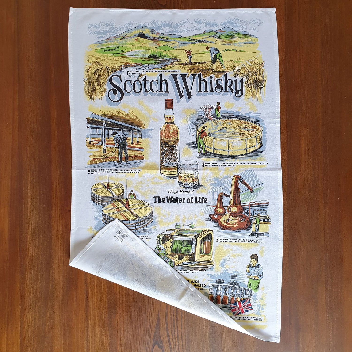 スコットランドの命の水、スコッチウィスキーのティータオル。ウィスキーの製造工程は絵と共に描かれています。