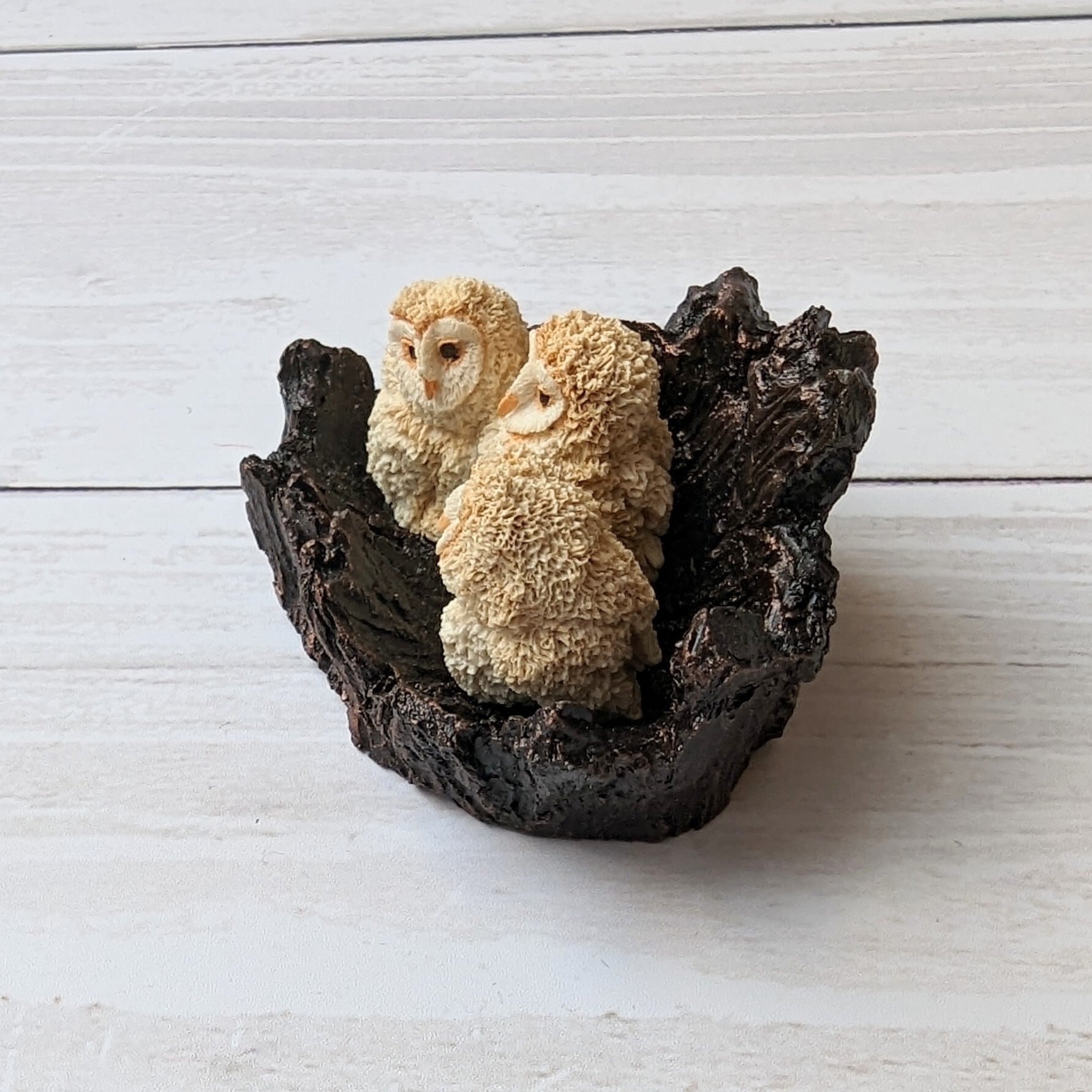 めんふくろうの子供達の置物。メンフクロウ(面梟)は、フクロウ目メンフクロウ科の鳥です。荒れ地や林に住み、夜行性でネズミなどを補食します。ヨーロッパ・アフリカ・南アジアなどに分布しています。